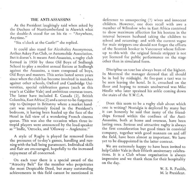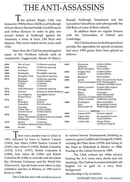 For all of us of a certain age, and of a northern inclination, the Anti-Assassins set the gold standard for representative rugby in the north-west of England. I first played for them in the mid-1960s when I was in my early twenties and I finished 25 years later playing with my son at the age of 48. Throughout all of those years, and since, we all benefitted from the inspiration and the example set by Stuart Faulds, Ken Woolley, the Kenyons and all their companions of yesteryear.